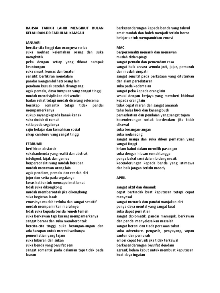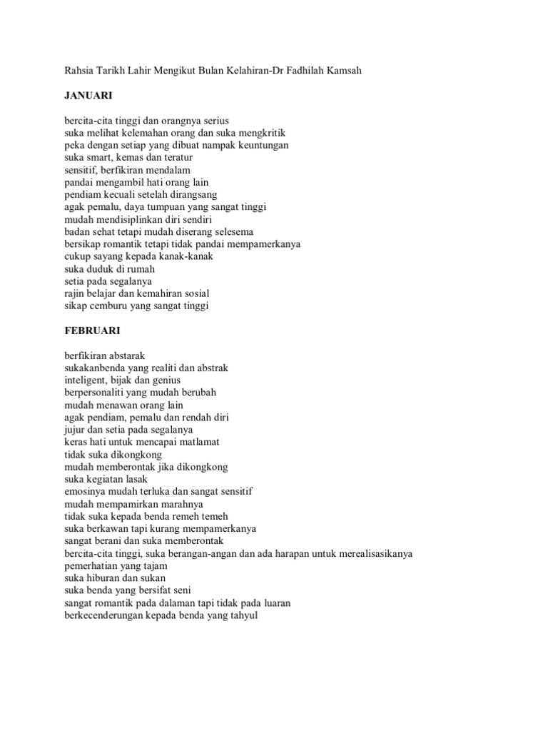 Rahsia Tarikh Lahir Mengikut Bulan Kelahiran Pdf